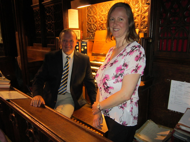 Halifax Minster hosted Nigel Ogden, star of BBC2’s musical programme ‘The Organist Entertains,’ in a fascinating evening concert of popular and light classical music on 12 July 2014. Nigel is pictured above at the console of the Minster organ, with Helen Austwick, President of the Halifax and District Organists’ Association (right).